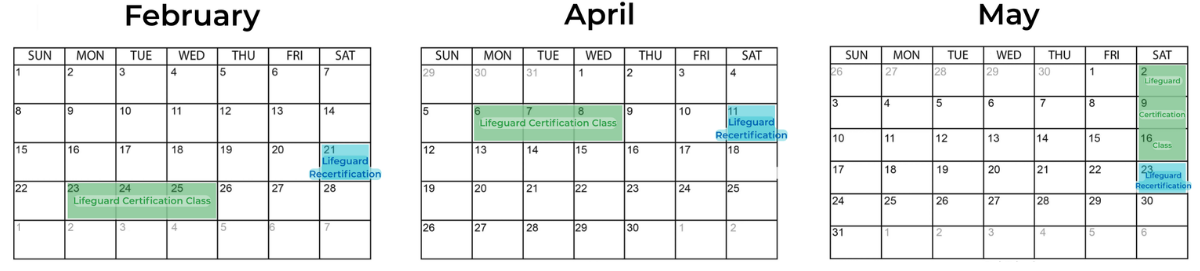 Lifeguard Certification Classes are in green, Lifeguard Recertification classes are in blue.